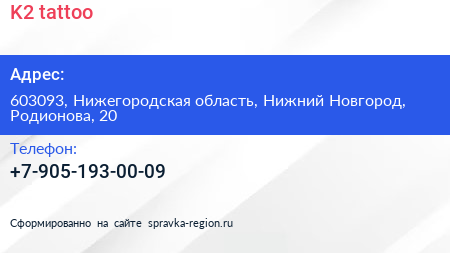 K2 tattoo по адресу 603093, Нижегородская область, Нижний Новгород, Родионова, 20 в дальнейшем Организация, размещена в следующих категориях: