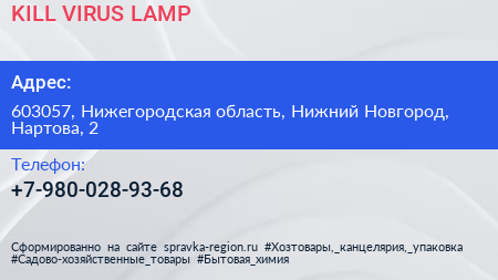 KILL VIRUS LAMP по адресу 603057, Нижегородская область, Нижний Новгород, Нартова, 2 в дальнейшем Организация, размещена в следующих категориях: