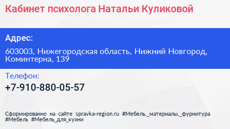 Кабинет психолога Натальи Куликовой по адресу 603003, Нижегородская область, Нижний Новгород, Коминтерна, 139 в дальнейшем Организация, размещена в следующих категориях: