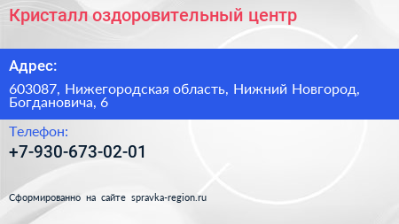 Кристалл, оздоровительный центр по адресу 603087, Нижегородская область, Нижний Новгород, Богдановича, 6 в дальнейшем Организация, размещена в следующих категориях: