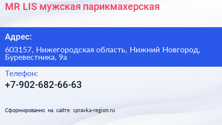 MR.LIS, мужская парикмахерская по адресу 603157, Нижегородская область, Нижний Новгород, Буревестника, 9а в дальнейшем Организация, размещена в следующих категориях: