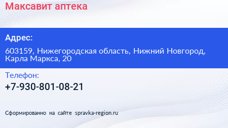 Максавит, аптека по адресу 603159, Нижегородская область, Нижний Новгород, Карла Маркса, 20 в дальнейшем Организация, размещена в следующих категориях: