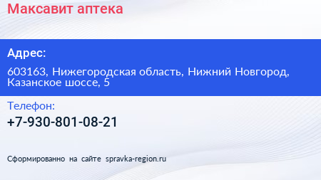 Максавит, аптека по адресу 603163, Нижегородская область, Нижний Новгород, Казанское шоссе, 5 в дальнейшем Организация, размещена в следующих категориях: