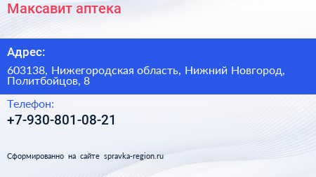 Максавит, аптека по адресу 603138, Нижегородская область, Нижний Новгород, Политбойцов, 8 в дальнейшем Организация, размещена в следующих категориях: