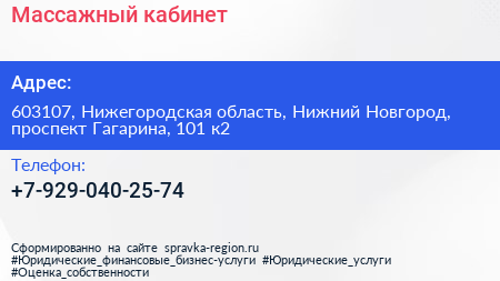 Массажный кабинет по адресу 603107, Нижегородская область, Нижний Новгород, проспект Гагарина, 101 к2 в дальнейшем Организация, размещена в следующих категориях: