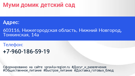 Муми домик, детский сад по адресу 603116, Нижегородская область, Нижний Новгород, Тонкинская, 14а в дальнейшем Организация, размещена в следующих категориях: