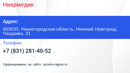 Ниармедик по адресу 603035, Нижегородская область, Нижний Новгород, Чаадаева, 31 в дальнейшем Организация, размещена в следующих категориях: