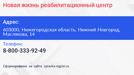Новая жизнь, реабилитационный центр по адресу 603000, Нижегородская область, Нижний Новгород, Маслякова, 14 в дальнейшем Организация, размещена в следующих категориях: