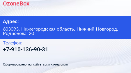 OzoneBox по адресу 603093, Нижегородская область, Нижний Новгород, Родионова, 20 в дальнейшем Организация, размещена в следующих категориях:
