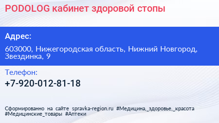 PODOLOG, кабинет здоровой стопы по адресу 603000, Нижегородская область, Нижний Новгород, Звездинка, 9 в дальнейшем Организация, размещена в следующих категориях: