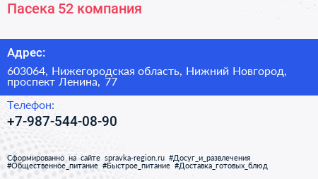 Пасека 52, компания по адресу 603064, Нижегородская область, Нижний Новгород, проспект Ленина, 77 в дальнейшем Организация, размещена в следующих категориях: