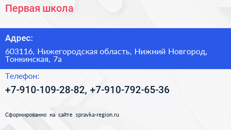 Первая школа по адресу 603116, Нижегородская область, Нижний Новгород, Тонкинская, 7а в дальнейшем Организация, размещена в следующих категориях:
