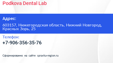 Podkova Dental Lab по адресу 603157, Нижегородская область, Нижний Новгород, Красных Зорь, 25 в дальнейшем Организация, размещена в следующих категориях: