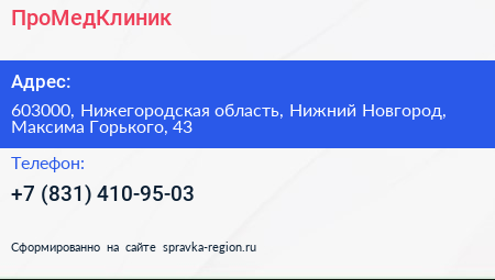 ПроМедКлиник по адресу 603000, Нижегородская область, Нижний Новгород, Максима Горького, 43 в дальнейшем Организация, размещена в следующих категориях: