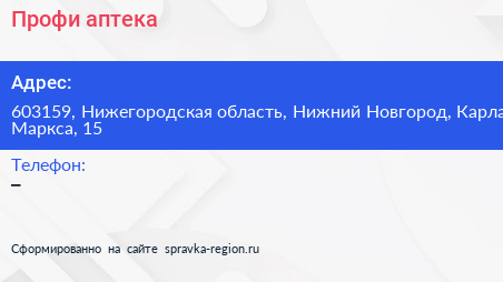 Профи, аптека по адресу 603159, Нижегородская область, Нижний Новгород, Карла Маркса, 15 в дальнейшем Организация, размещена в следующих категориях: