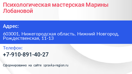 Психологическая мастерская Марины Лобановой по адресу 603001, Нижегородская область, Нижний Новгород, Рождественская, 11-13 в дальнейшем Организация, размещена в следующих категориях: