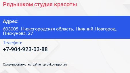 Рядышком, студия красоты по адресу 603005, Нижегородская область, Нижний Новгород, Пискунова, 27 в дальнейшем Организация, размещена в следующих категориях: