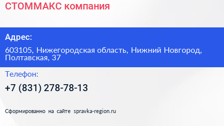 СТОММАКС, компания по адресу 603105, Нижегородская область, Нижний Новгород, Полтавская, 37 в дальнейшем Организация, размещена в следующих категориях: