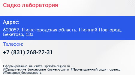 Садко, лаборатория по адресу 603057, Нижегородская область, Нижний Новгород, Бекетова, 13а в дальнейшем Организация, размещена в следующих категориях: