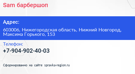 Sam, барбершоп по адресу 603006, Нижегородская область, Нижний Новгород, Максима Горького, 153 в дальнейшем Организация, размещена в следующих категориях: