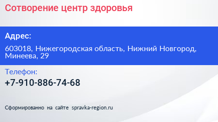 Сотворение, центр здоровья по адресу 603018, Нижегородская область, Нижний Новгород, Минеева, 29 в дальнейшем Организация, размещена в следующих категориях: