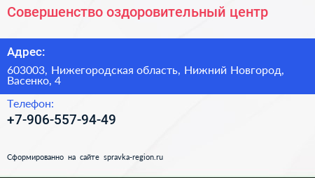 Совершенство, оздоровительный центр по адресу 603003, Нижегородская область, Нижний Новгород, Васенко, 4 в дальнейшем Организация, размещена в следующих категориях: