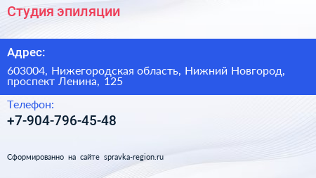 Студия эпиляции по адресу 603004, Нижегородская область, Нижний Новгород, проспект Ленина, 125 в дальнейшем Организация, размещена в следующих категориях: