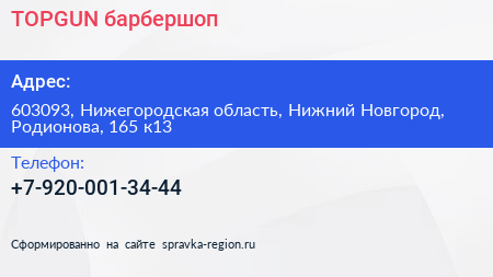 TOPGUN, барбершоп по адресу 603093, Нижегородская область, Нижний Новгород, Родионова, 165 к13 в дальнейшем Организация, размещена в следующих категориях: