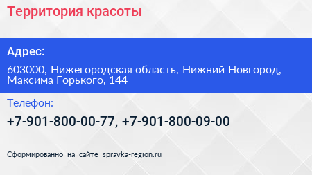 Территория красоты по адресу 603000, Нижегородская область, Нижний Новгород, Максима Горького, 144 в дальнейшем Организация, размещена в следующих категориях: