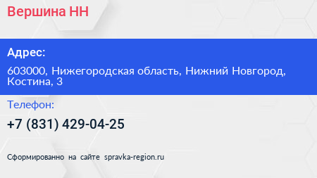 Вершина-НН по адресу 603000, Нижегородская область, Нижний Новгород, Костина, 3 в дальнейшем Организация, размещена в следующих категориях: