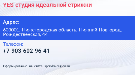 YES, студия идеальной стрижки по адресу 603001, Нижегородская область, Нижний Новгород, Рождественская, 44 в дальнейшем Организация, размещена в следующих категориях: