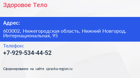 Здоровое Тело по адресу 603002, Нижегородская область, Нижний Новгород, Интернациональная, 95 в дальнейшем Организация, размещена в следующих категориях: