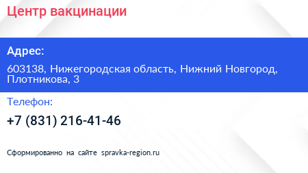 Центр вакцинации по адресу 603138, Нижегородская область, Нижний Новгород, Плотникова, 3 в дальнейшем Организация, размещена в следующих категориях: