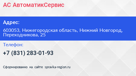 АС-АвтоматикСервис по адресу 603053, Нижегородская область, Нижний Новгород, Переходникова, 25 в дальнейшем Организация, размещена в следующих категориях: