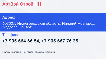 АртВэй-Строй НН по адресу 603037, Нижегородская область, Нижний Новгород, Федосеенко, 45г в дальнейшем Организация, размещена в следующих категориях: