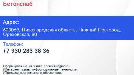 Бетонснаб по адресу 603069, Нижегородская область, Нижний Новгород, Ореховская, 80 в дальнейшем Организация, размещена в следующих категориях: