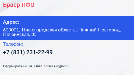Браер ПФО по адресу 603001, Нижегородская область, Нижний Новгород, Почаинская, 35 в дальнейшем Организация, размещена в следующих категориях: