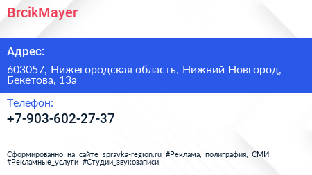 BrcikMayer по адресу 603057, Нижегородская область, Нижний Новгород, Бекетова, 13а в дальнейшем Организация, размещена в следующих категориях: