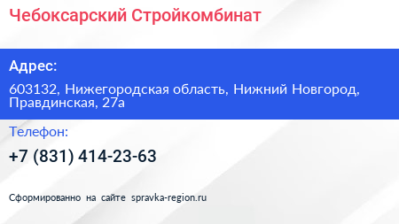 Чебоксарский Стройкомбинат по адресу 603132, Нижегородская область, Нижний Новгород, Правдинская, 27а в дальнейшем Организация, размещена в следующих категориях: