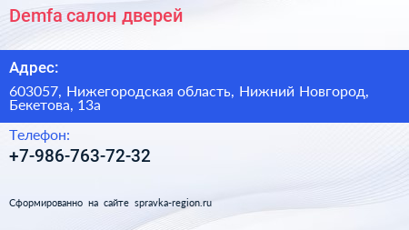 Demfa, салон дверей по адресу 603057, Нижегородская область, Нижний Новгород, Бекетова, 13а в дальнейшем Организация, размещена в следующих категориях: