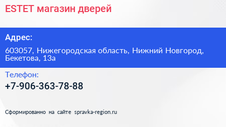 ESTET, магазин дверей по адресу 603057, Нижегородская область, Нижний Новгород, Бекетова, 13а в дальнейшем Организация, размещена в следующих категориях: