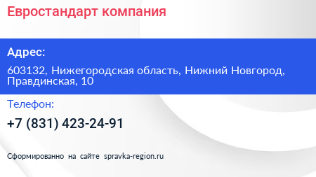 Евростандарт, компания по адресу 603132, Нижегородская область, Нижний Новгород, Правдинская, 10 в дальнейшем Организация, размещена в следующих категориях: