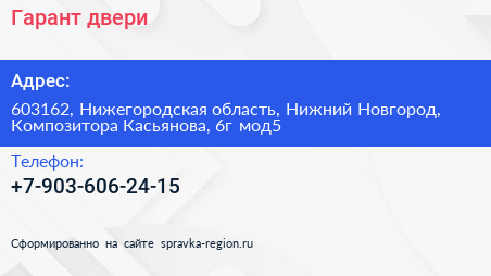 Гарант-двери по адресу 603162, Нижегородская область, Нижний Новгород, Композитора Касьянова, 6г мод5 в дальнейшем Организация, размещена в следующих категориях: