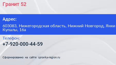 Гранит-52 по адресу 603083, Нижегородская область, Нижний Новгород, Янки Купалы, 16а в дальнейшем Организация, размещена в следующих категориях: