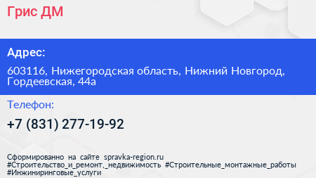Грис-ДМ по адресу 603116, Нижегородская область, Нижний Новгород, Гордеевская, 44а в дальнейшем Организация, размещена в следующих категориях: