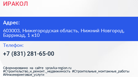 ИРАКОЛ по адресу 603003, Нижегородская область, Нижний Новгород, Баррикад, 1 к10 в дальнейшем Организация, размещена в следующих категориях: