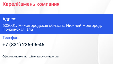 КарелКамень, компания по адресу 603001, Нижегородская область, Нижний Новгород, Почаинская, 14а в дальнейшем Организация, размещена в следующих категориях: