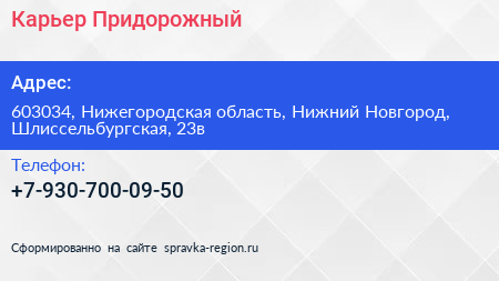 Карьер Придорожный по адресу 603034, Нижегородская область, Нижний Новгород, Шлиссельбургская, 23в в дальнейшем Организация, размещена в следующих категориях: