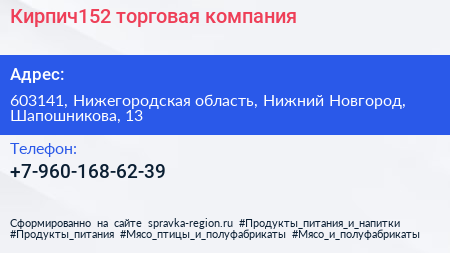 Кирпич152, торговая компания по адресу 603141, Нижегородская область, Нижний Новгород, Шапошникова, 13 в дальнейшем Организация, размещена в следующих категориях: