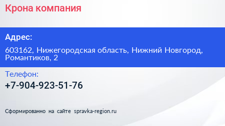 Крона, компания по адресу 603162, Нижегородская область, Нижний Новгород, Романтиков, 2 в дальнейшем Организация, размещена в следующих категориях: